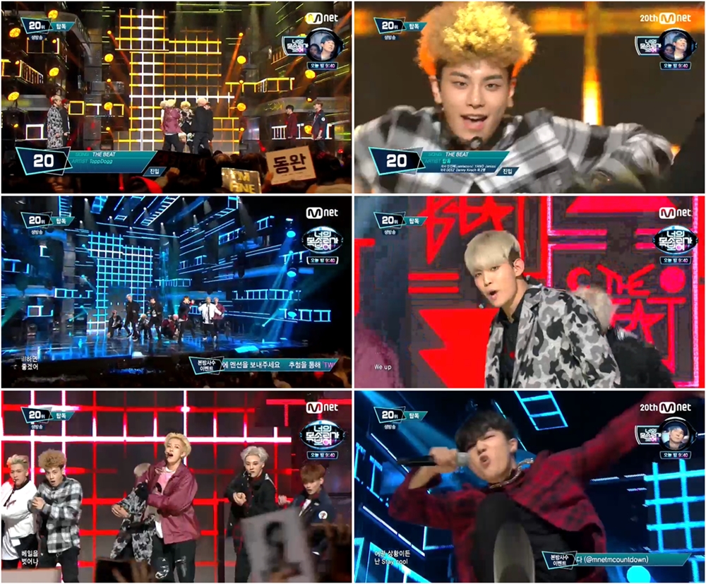 29일 오후 6시 방송된 Mnet ‘엠카운트다운’에 출연한 탑독은 타이틀곡 ‘THE BEAT’로 무대를 꾸몄다.