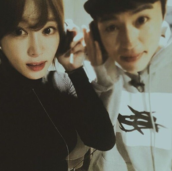공개된 사진 속 오민석은 배우 강예원과 함께 헤드폰을 들고 미소를 지으며 카메라를 응시하고 있다.