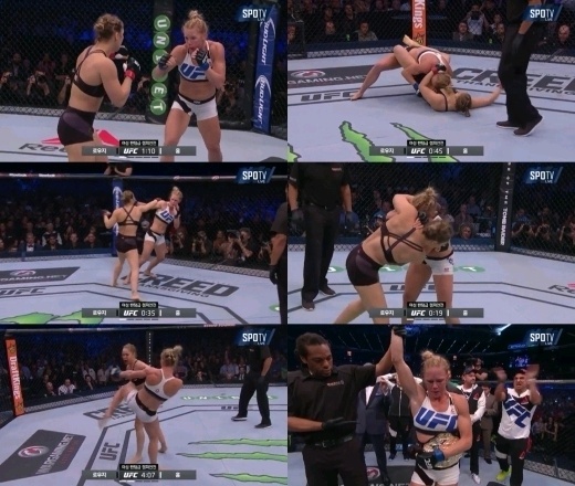 1라운드부터 두 사람은 치열한 공격을 펼쳤다. 특히 홀리는 지친 기색 없이 론다 로우지에 공격하며 마무리 지었다.