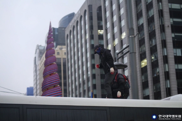 [미디어펜=김규태기자] 지난 14일 서울시청 앞부터 광화문 광장 사이의 공간은 시위대의 폭력으로 점철된 무법천지였다. 14일 오후부터 시작된 민중총궐기 시위는 폴리스라인을 넘은 뒤, 광화문광장 앞에서의 불법폭력시위로 그 막을 내렸다. 시위대는 경찰버스에 사다리를 걸어 올라타거나, 밧줄을 걸어 잡아당기고 부수기까지 했다. 폭력시위를 벌이는 자들의 공통점은 모자에 마스크를 써서 신원을 식별할 수 없다는 것이었다.