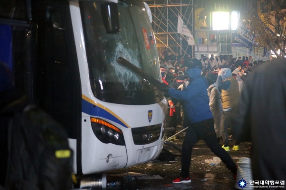 ▲ 지난 14일 서울 도심은 불법·폭력 시위로 얼룩진 대규모 반정부 집회로 몸살을 앓았다. 진보연대와 민주노총을 비롯한 53개 단체는 미리 준비된 쇠파이프, 각목, 횃불 등으로 폭력시위를 조장했고 그 과정에서 100여명의 경찰이 부상을 당하고 50대에 달하는 버스가 파손됐다./사진=한국대학생포럼 |
