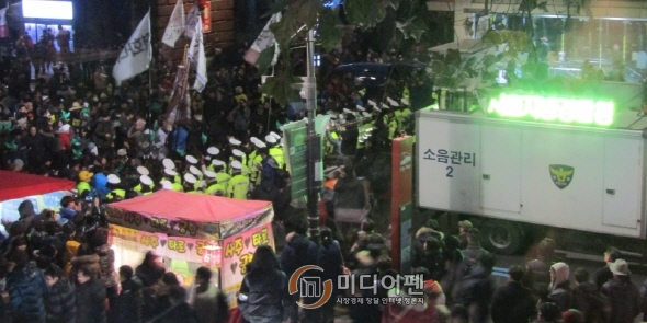 [미디어펜=김규태·한기호 기자] 주말인 5일 서울 도심에서 지난 11월 14일 열린 민중총궐기 집회의 후속 대규모 집회가 열린 가운데, 시위대의 집단적인 불법폭력 행위가 발생하지 않았지만, 시위행진 과정 곳곳에서 욕설과 몸싸움이 일어났다. 서울대병원 앞 최종 농성장에서는 술자리와 고성이 오고 가기도 했다.