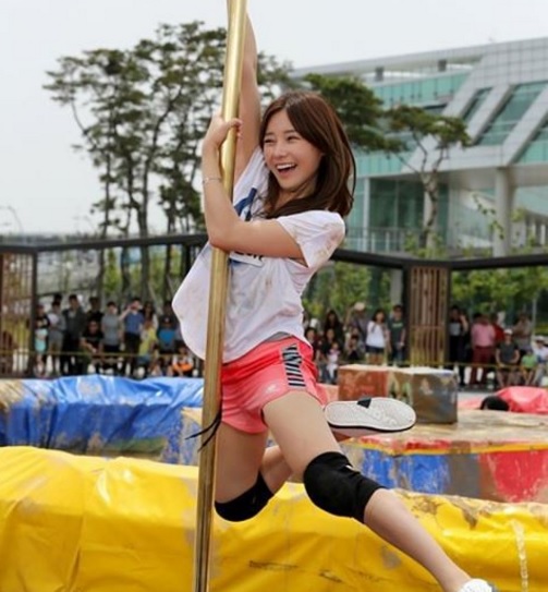 천이슬은 공개된 사진 속에서 '드림팀' 장애물 세트에 설치된 봉을 잡고 폴댄스 동작을 취하고 있다.
