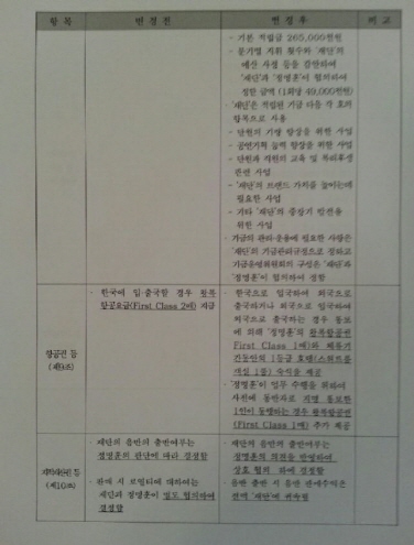결론적으로 새로운 계약서 내용을 요약하면 ▶매년 수억 원 사용되는 항공료를 자유롭게 해주고, ▶매년 10억 원 상당의 1등급 호텔 스위트룸을 추가로 사용하게 해주며, ▶대외적인 활동은 모두 풀어 자유로이 해준다. 이에 더해 ▶지급되는 보수를 기탁하여 조성하는 기금의 운영권 50%는 정 감독이 행사하게 하는 내용이다.