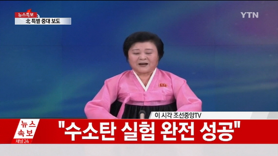 북한은 이날 낮 12시30분 방영된 조선중앙방송 특별 중대보도를 통해 “조선노동당의 전략적 셈법에 따라 주체105(2016)년 1월6일 10시 주체조선의 첫 수소탄 시험이 성공적으로 진행되었다”고 밝혔다.