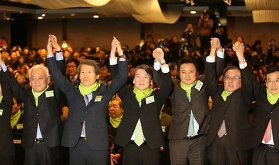 ▲ 안철수 의원이 10일 오후 서울 세종문화회관 세종홀에서 열린 신당 '국민의당'(가칭) 창당 발기인대회에서 김한길 의원, 한상진 서울대 명예교수, 김영환 의원 등과 함께 손을 맞잡아 들고 인사하고 있다./사진=연합뉴스