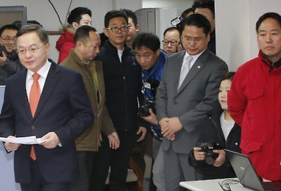▲ 새누리당 지도부로부터 20대 총선 '험지 출마'를 요구 받아온 안대희 전 대법관이 17일 여의도 당사에서 20대 총선 출마지역 발표 기자회견을 위해 회견장으로 들어서고 있다. 맨 오른쪽은 마포갑 새누리당 강승규 당협위원장./사진=연합뉴스