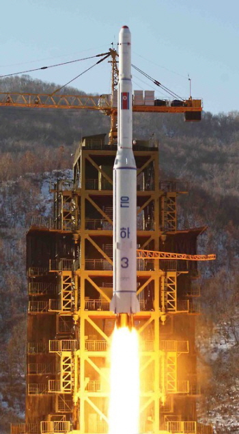 ▲ 북한 조선중앙통신이 2012년 12월 보도한 평안북도 철산군 동창리 서해위성발사장에서 발사되고 있는 북한 장거리 로켓 은하3호./사진=연합뉴스