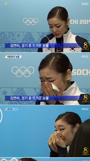 21일 MBC '뉴스데스크'는 김연아가 현역 선수로서는 마지막 경기를 끝낸 뒤 무대 뒤에서 눈물을 흘리는 모습을 공개했다.