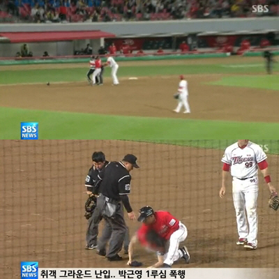 지난달 30일 광주 챔피언스필드에서 열린 KIA타이거즈와 SK와이번스와의 경기에서는 만취한 관객이 경기장에 난입해 박근영 심판을 폭행했다.