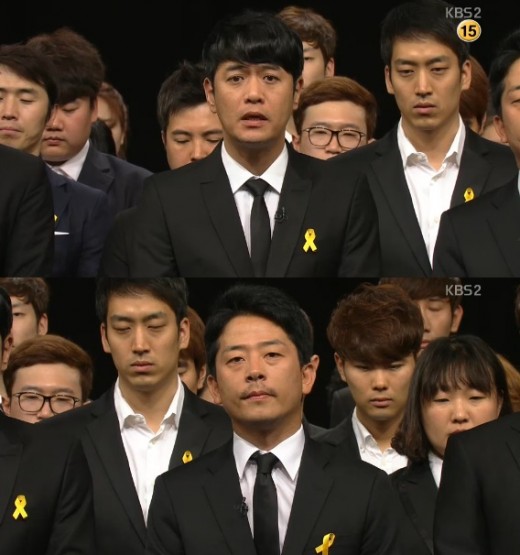 25일 방송된 KBS2 예능프로그램 '개그콘서트'에서는 개그맨들이 모두 검은 양복을 입고 등장, 세월호 참사 애도의 메시지를 전하며 오프닝을 장식했다.