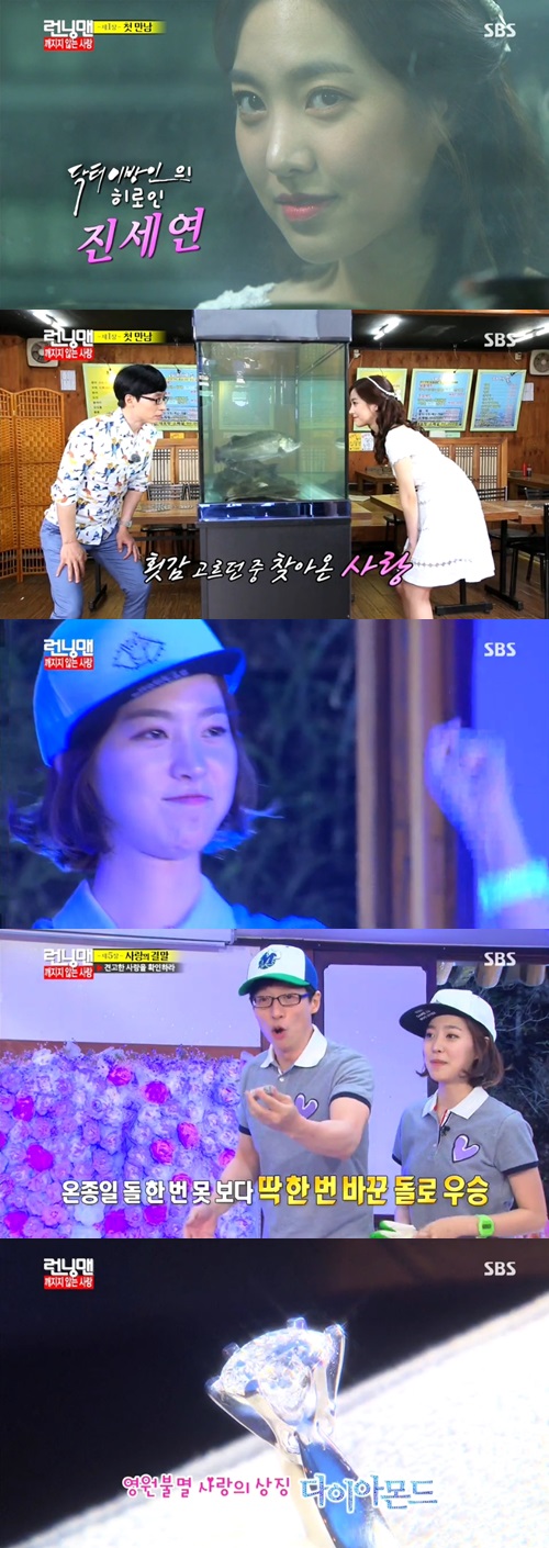 치열한 공방전 끝에 결국 런닝맨 진세연 유재석에게는 최종우승 상품으로 1캐럿짜리 다이아몬드가 주어졌다. 진세연은 기쁜 마음에 선물을 듣고 즐거워했다.