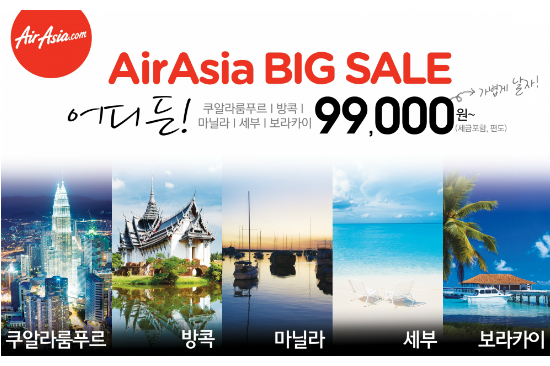 에어아시아 그룹은 2일 한국시간 기준 새벽 1시부터 8일까지 말레이시아, 태국, 필리핀 등 편도항공권을 최저 9만9000원의 빅 세일 특가 요금으로 선보일 예정이다.