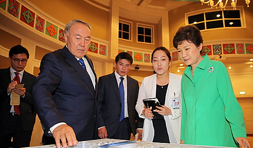▲ 카자흐스탄을 국빈방문 중인 박근혜 대통령이 19일 오후 (현지시각) 아스타나 한 호텔에서 나자르바예프 대통령으로 부터 2017년 아스타나 엑스포 시설과 관련해 설명을 듣고 있다. / 뉴시스