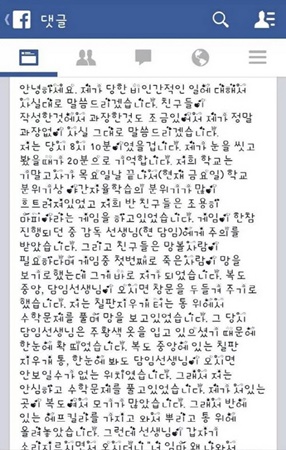 그는 “선생님이 갑자기 소리 지르시면서 오시더니 ‘너 임마 왜 나와서 공부해?’라고 말했다. 선생님은 교실로 들어오라고 한 뒤 에프킬라를 잡으시고 안경을 벗으라고 했다”며 “가까운 곳에서 에프킬라를 뿌려 제 눈에 많은 양의 에프킬라가 들어갔다. 저는 괴로워서 고개를 돌렸지만 다시 머리를 잡고 뿌렸다. 복도에서 너무 괴로워서 눈을 잡고 있었다"고 덧붙였다.”
