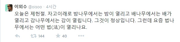 이외수는 17일 자신의 트위터를 통해 “오늘은 제헌절. 자고이래(옛날부터 지금까지)로 밤나무에서는 밤이 열리고 배나무에서는 배가 열리고 감나무에서는 감이 열린다. 그것이 정상이다”는 글을 게재했다.