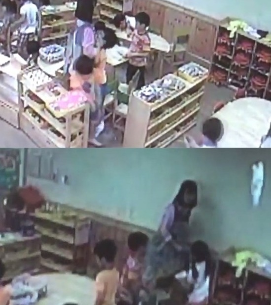 지난 6월9일과 13일에 촬영된 이 CCTV 영상에는 여교사가 아이의 양쪽 볼을 잡아 들어올리거나 책으로 아이의 몸을 내리치는 모습이 담겨있다.