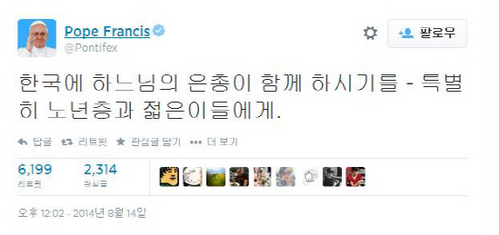 프란치스코 교황은 14일 자신의 트위터 계정을 통해 한글로 “한국에 하느님의 은총이 함께 하시기를 특별이 노년층과 젊은이들에게”라는 글을 게재했다.