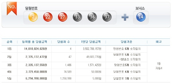 이번에 6개 번호를 모두 맞힌 1등 당첨자는 4명이다. 1인당 35억270만6157만원을 받는다.