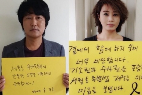 16일 세월호 특별법 제정 촉구를 위한 영화인준비모임에 따르면 송강호와 김혜수는 세월호 유가족들을 위해 응원 메시지를 적어 유가족을 위로하는 동시에 응원 메시지를 전했다.