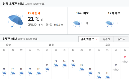 특히 이날 낮 12시부터는 시간당 30~40mm의 집중호우가 쏟아지고 있어 주의가 요구된다.