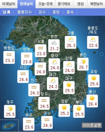 낮 최고 기온은 서울 28도, 대전 29도, 강릉 30도로 중부지방은 어제보다 약간 높다. 남부지방은 광주 29도, 대구 31도 등 어제와 비슷하거나 조금 더 오른다.