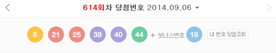 6일 제614회 나눔로또 추첨결과 1등 당첨번호는 8, 21, 25, 39, 40, 44으로 결정됐다.
