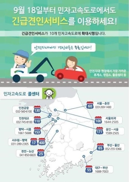 기존에는 도로공사가 운영하는 재정고속도로에서만 시행됐던 무료 긴급견인 서비스는 확대 시행되며 갑자기 정차한 차량을 휴게소 영업소 졸음쉼터까지 견인함에 있어 불편함이 해소될 전망이다.