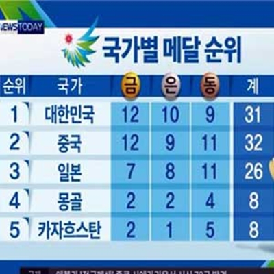 한국은 금메달 12, 은메달 10, 동메달 9 등 총 31개의 메달로 메달순위 1위(금메달 기준)를 지키고 있다.