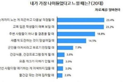 최근 아르바이트 전문포털 알바천국은 전국 20대에서 50대 이상 구직자 2134명을 대상으로 나이 의식하는 순간에 대한 설문조사를 진행했다.