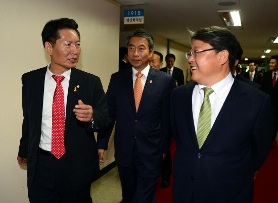 | ▲ 정종섭(가운데) 안전행정부 장관이 7일 오전 서울 종로구 정부서울청사에서 국회 안전행정위원회 2014 국정감사 오전일정을 마치고 나서 새누리당 조원진(오른쪽) 의원과 새정치민주연합 정청래 의원과 이야기를 나누고 있다. |