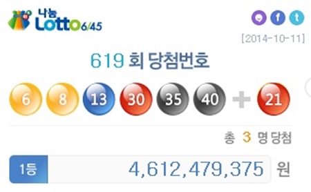 이번 로또619회의 번호 6개를 모두 맞힌 1등 당첨자는 3명으로 각 46억1247만9375원의 당첨금을 받는다.
