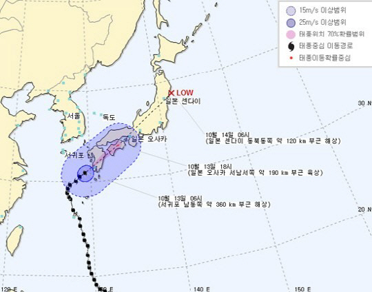 기상청 관계자는 “낮까지 제주도와 남해안, 경상남북도 동해안, 강원도 영동에는 많은 비와 더불어 바람이 매우 강하게 불 것으로 보인다”며 “시설물관리와 안전사고에 각별히 주의바란다”고 당부했다.