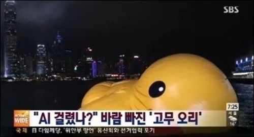 하지만 이날 오후 2시 러버덕이 조금씩 고개를 숙이는 등 바람이 빠지는 모습을 보이더니 결국 침몰하는 어처구니 없는 상황이 벌어졌다.