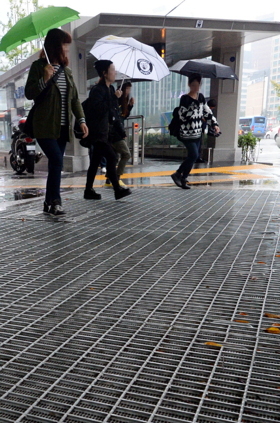 | ▲ 20일 오전 서울 중구 태평로 시청역 출구 앞에서 보행자 지면과 같은 높이로 설치된 환풍구 위로 우산을 쓴 시민들이 지나고 있다. |