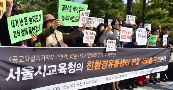 | ▲ 공교육살리기학부모연합, 바른사회시민회의 회원들이 지난 15일 서울시교육청 앞에서 친환경 무상급식 확대 계획 반대 기자회견을 갖고 있다. |