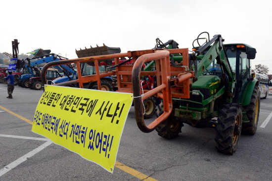 | ▲ 25일 오전 경기도 파주 임진각에서 대북전단보내기국민연합 등 보수단체가 4~5만장의 전단이 담긴 대형풍선을 북한으로 띄워 보낼 계획인 가운데 민통선 지역에서 농사를 짓는 지역주민들이 트랙터 등 농기계를 끌고 나와 전단 살포를 저지 할 준비를 하고 있다. |