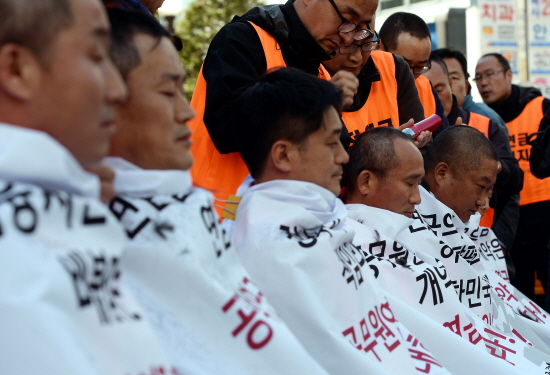 | ▲ 28일 오후 서울 여의도 새누리당사 앞에서 공무원노조가 '새누리당 연금개악안에 대한 전 지부장 삭발투쟁'을 진행하고 있다./뉴시스 |