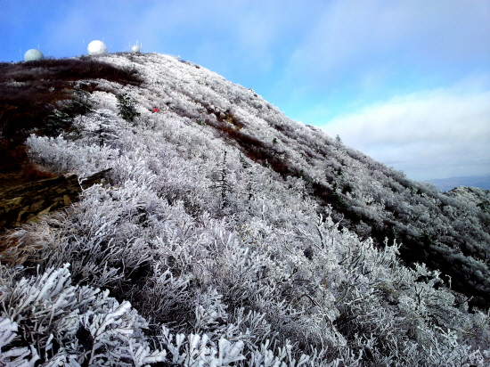 | ▲ 올가을 두 번째 눈 자료사진/국립공원 설악산 중청대피소 일대의 수목에 핀 상고대. |