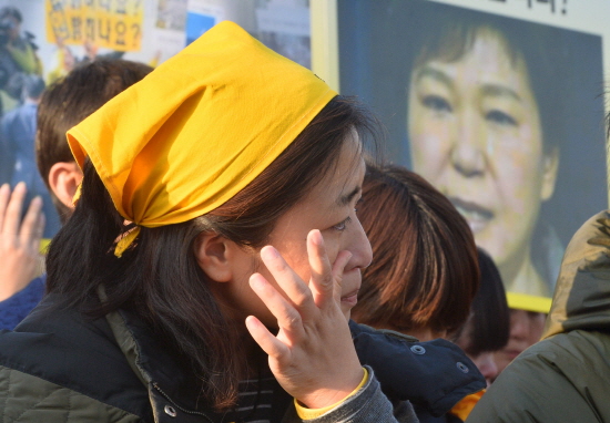 | ▲ 7일 오후 서울 여의도 국회 앞에서 세월호 특별법 국회 본회의 통과뒤후 세월호 가족대책위 등 유가족들과 리멤버0416 등 시민단체들이 본회의 결과에 대한 소감 및 향후 일정에 대해 전하는 기자회견을 하고 있는 가운데 한 참석자가 눈물을 흘리고 있다. /뉴시스 |