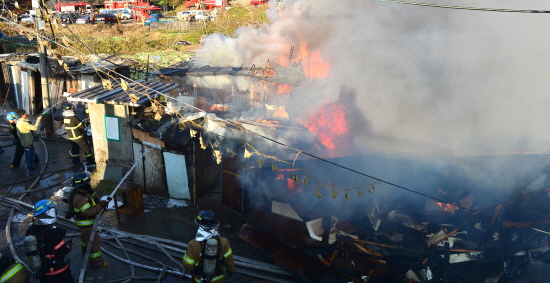 | ▲ 9일 오후 1시 52분께 서울 강남구 구룡마을에서 화재가 발생해 소방대원들이 진화 작업을 하고 있다./뉴시스 |
