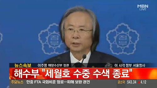 이주영 해양수산부 장관은 세종로 정부청사에서 관계장관회의에서 "오늘부로 수색을 종료 한다"고 11일 밝혔다.