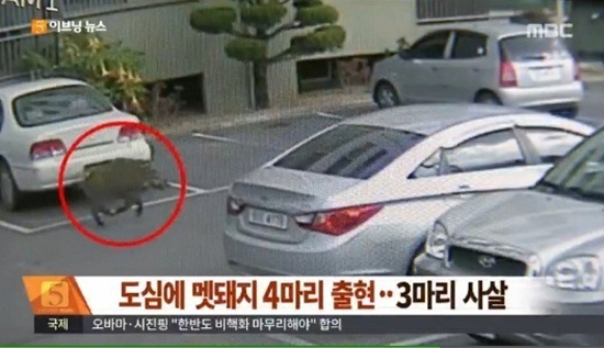 지난 11일 오전 경북 경주 동천초등학교 부근에 멧돼지들이 출몰했다. 이후 포획단은 인근 신라중학교에서 어미 멧돼지 1마리와 새끼 2마리를 사살했다.
