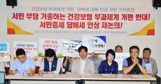 | ▲ 무상의료운동본부 회원들이 지난 23일 서울 종로구 참여연대 느티나무홀에서 열린 정부 건강보험 부과체계 개편안과 담배세 인상 문제점 기자회견을 갖고 있다./뉴시스 |