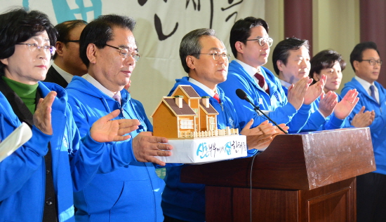 | ▲ 새정치민주연합 우윤근 원내대표를 비롯한 의원들이 지난 13일 서울 여의도 국회 의원회관에서 열린 '신혼부부에게 집 한채를' 포럼 출범식 및 토론회에서 출범식을 마친 뒤 박수를 치고 있다. /뉴시스 |