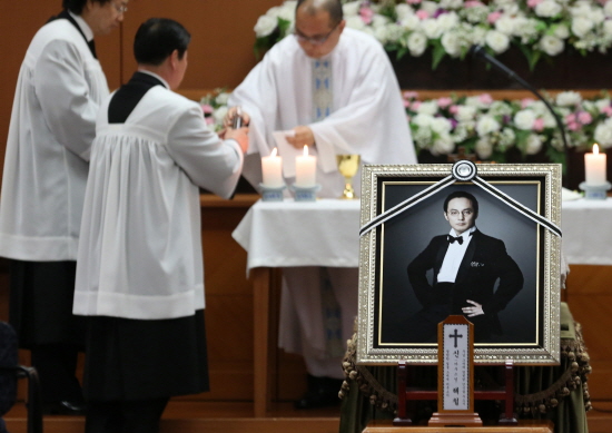 | ▲ 지난달 27일 저산소 허혈성 뇌손상으로 숨진 가수 신해철 영결식이 31일 오전 서울 송파구 풍납동 서울아산병원 장례식장에서 엄수되고 있다. /뉴시스 |