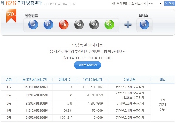 29일 제626회 나눔로또 추첨 결과 '13·14·26·33·40·43'번이 1등 당첨번호로 결정됐다.