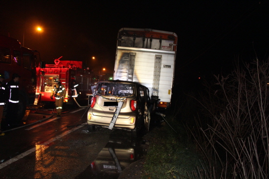 | ▲ 일가족 5명 사망. 30일 0시24분께 경기 평택시 고덕면 방축리 38번 국도에서 박모(31·여)씨가 몰던 레이 승용차가 갓길에 주차된 트럭을 들이받아 박씨와 박씨의 차량안에 있던 일가족 5명이 사망하는 안타까운 일이 발생했다./뉴시스 |