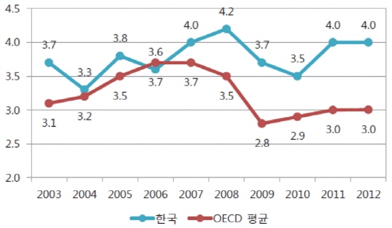 조 연구실장은 이어 GDP 대비 법인세 비중에 대하여 자세히 설명했는데, “OECD 평균은 2.8%(`09년)에서 3.0%(`12년)로 증가한 반면, 한국은 3.5%(`10년)에서 4.0%(`12년)로 가장 가파르게 증가했다”고 지적했다.