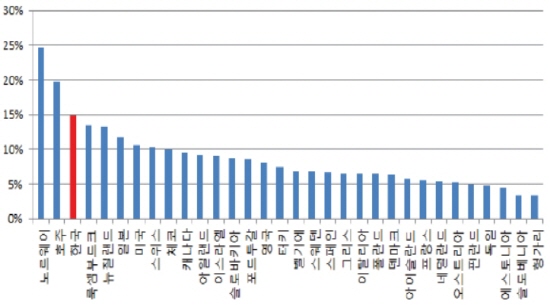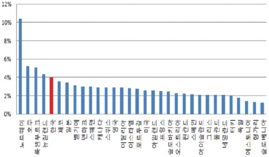 ▲ 국가별 GDP 대비 법인세수 비중 (%) |